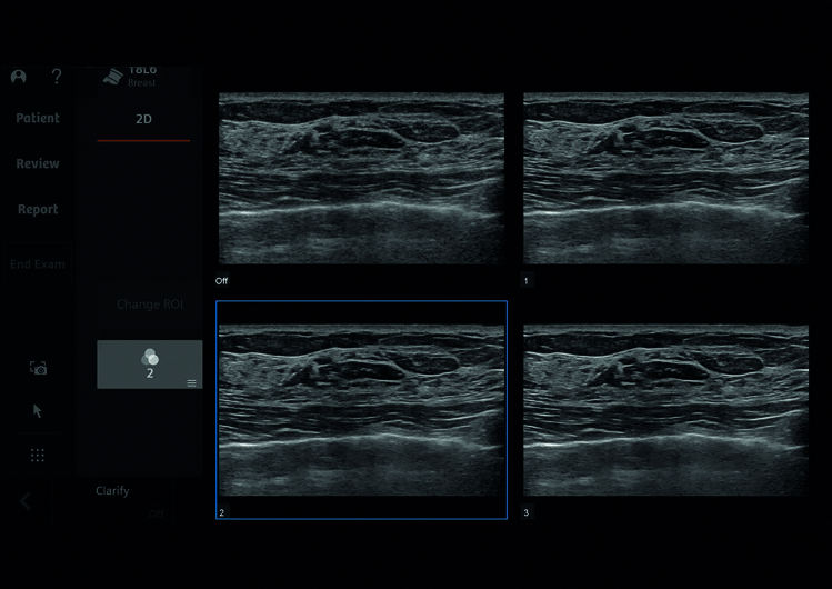 L’esclusivo metodo di ottimizzazione dell’immagine di Siemens ti fa scegliere direttamente il tipo di immagine che preferisci con un semplice tocco sullo schermo TouchScreen. Il sistema mostra quattro immagini con diversi livelli di compund e speckle reduction in modo da vedere subito quale mappa permette una migliore differenziazione delle strutture anatomiche senza dover manualmente impostare i parametri.