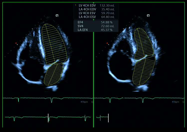 Il pacchetto eSie Left Heart permette di identificare automaticamente le pareti dell’atrio e del ventricolo sinistro dopo l’acquisizione di una clip in 4-camere o in 2-camere in modo da calcolare automaticamente la frazione di eiezione atriale e ventricolare.